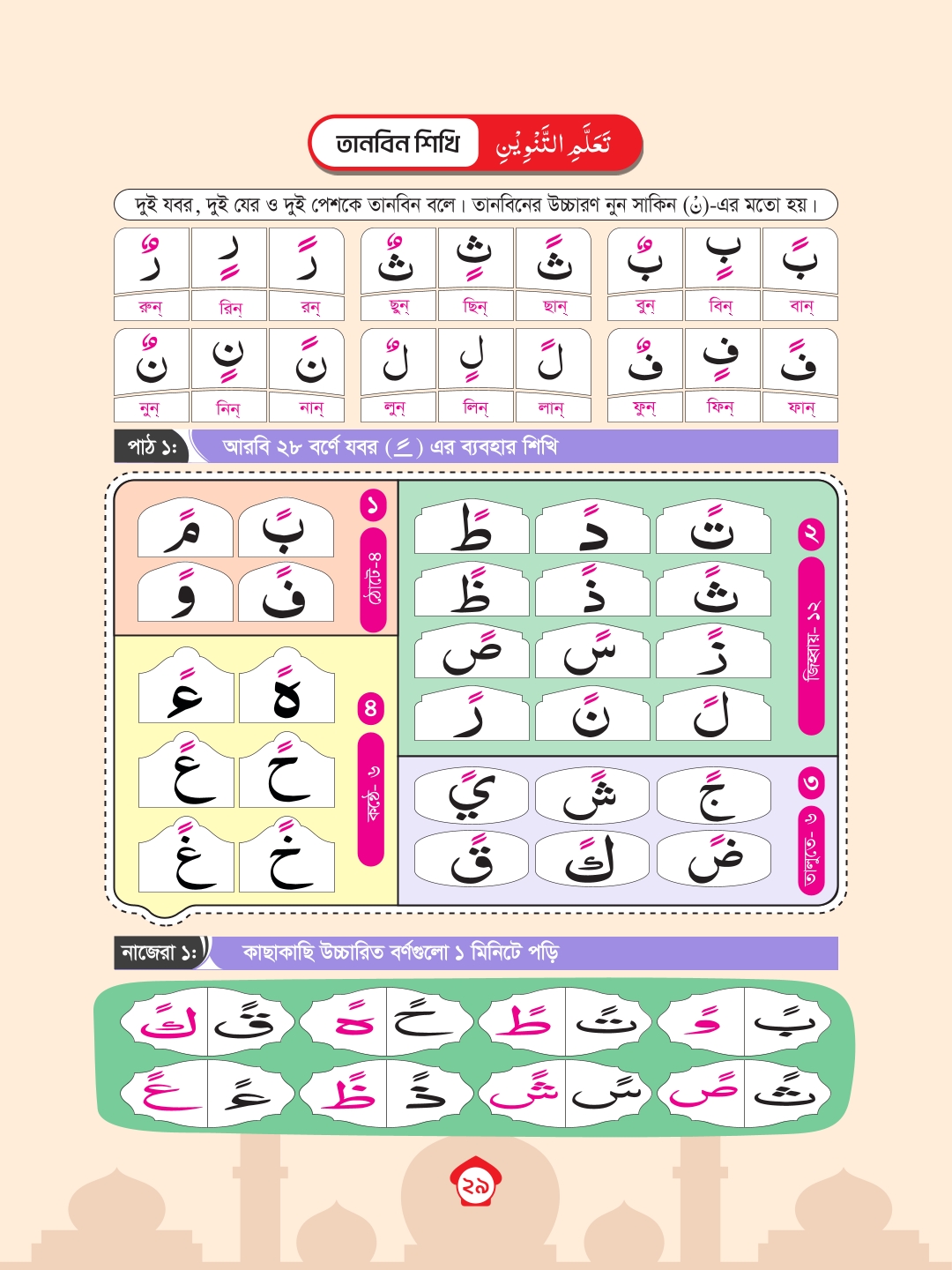বইটি চার রঙে মুদ্রিত এবং আকর্ষণীয়ভাবে নকশা করা হয়েছে, যাতে শিশুদের শেখার আগ্রহ বৃদ্ধি পায়। এতে অন্তর্ভুক্ত রয়েছে প্রি-লেভেল কায়দার পাঠ—আরবি বর্ণমালা, পড়া ও লেখা অনুশীলন, শব্দ গঠন, হরকত, তানউইন, জযম ও তাশদিদসহ প্রাথমিক ধ্বনিগত শিক্ষা।