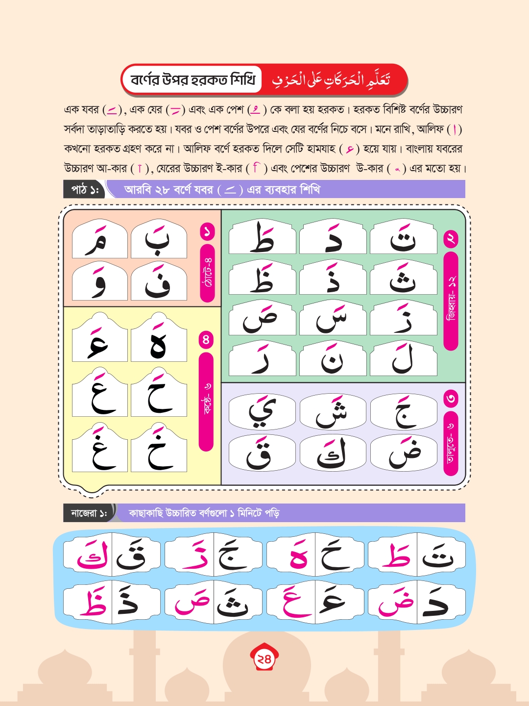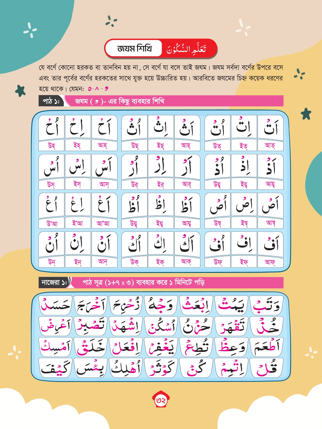 বইটি চার রঙে মুদ্রিত এবং আকর্ষণীয়ভাবে নকশা করা হয়েছে, যাতে শিশুদের শেখার আগ্রহ বৃদ্ধি পায়। এতে অন্তর্ভুক্ত রয়েছে প্রি-লেভেল কায়দার পাঠ—আরবি বর্ণমালা, পড়া ও লেখা অনুশীলন, শব্দ গঠন, হরকত, তানউইন, জযম ও তাশদিদসহ প্রাথমিক ধ্বনিগত শিক্ষা।