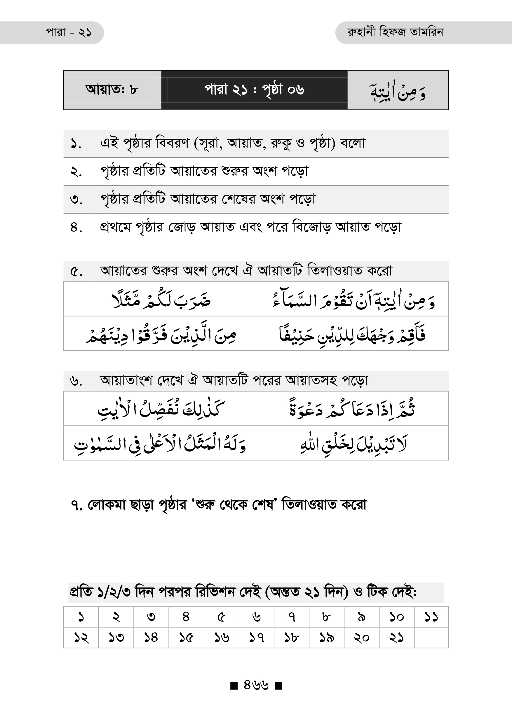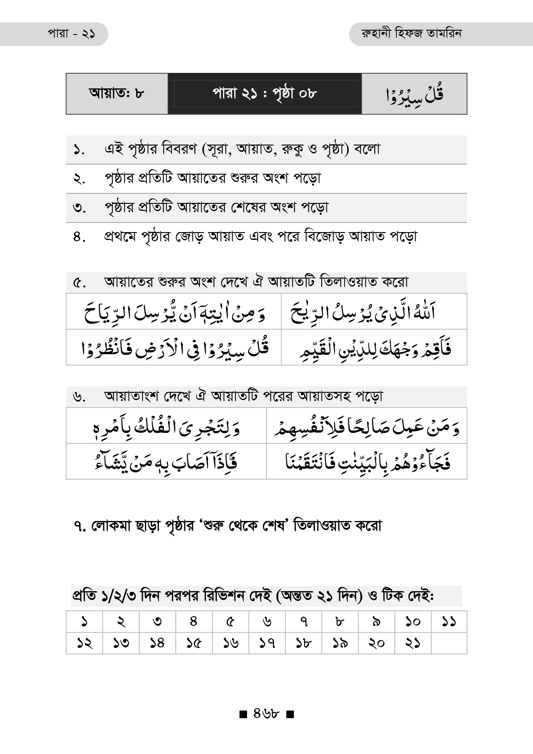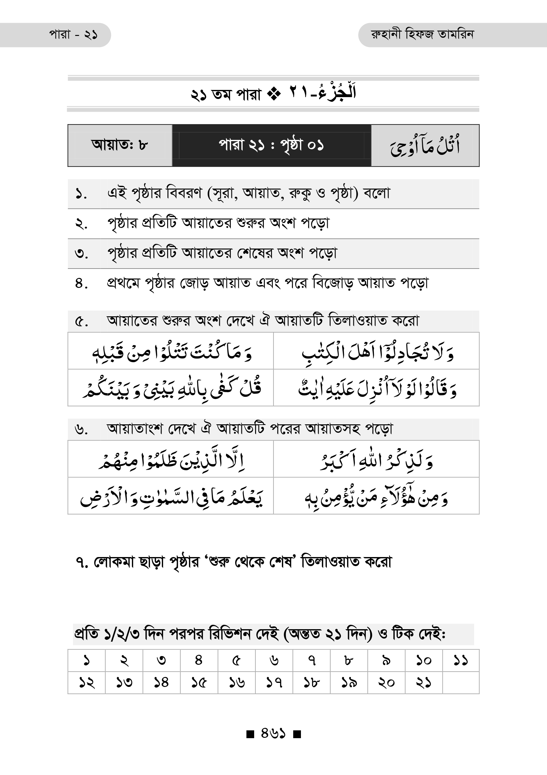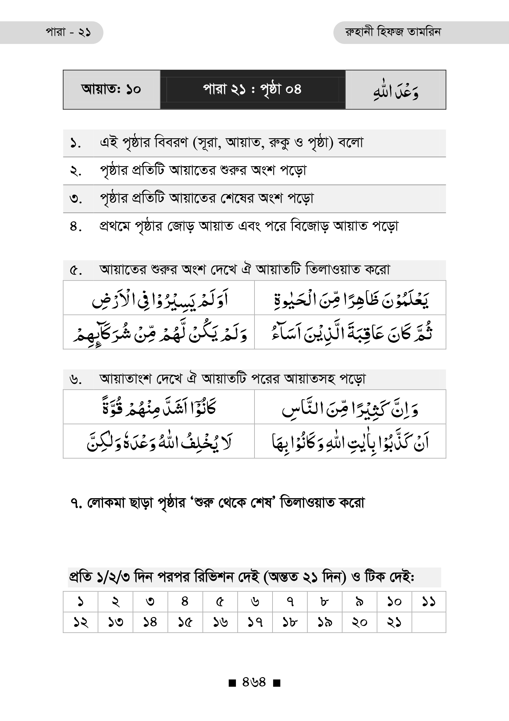 প্রতিটি পৃষ্ঠার নিচে রয়েছে ২১ দিনের রিভিশন টিক বক্স, যা ধারাবাহিক অধ্যবসায় ও স্মৃতি দৃঢ়ীকরণে অনুপ্রেরণা যোগায়।