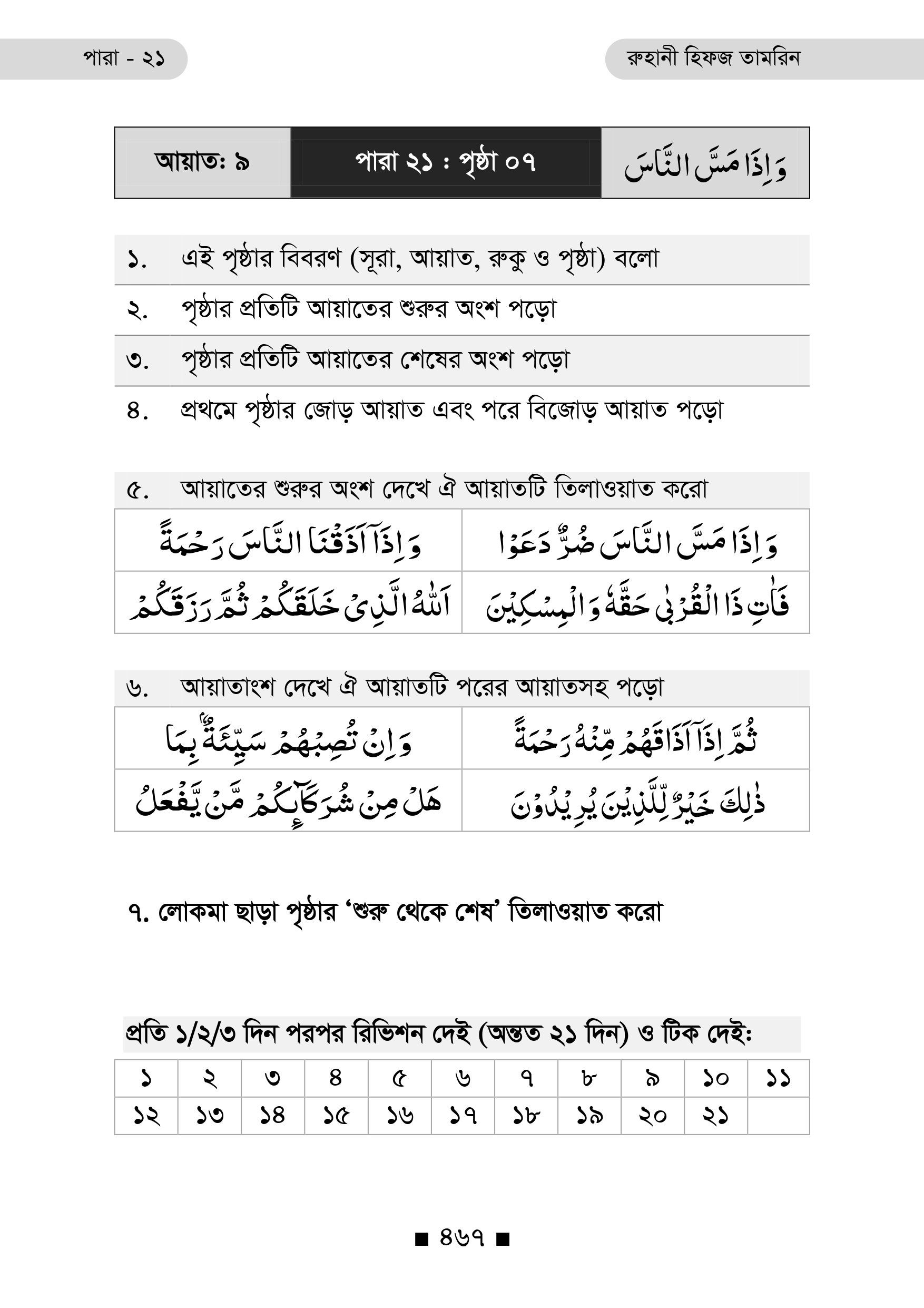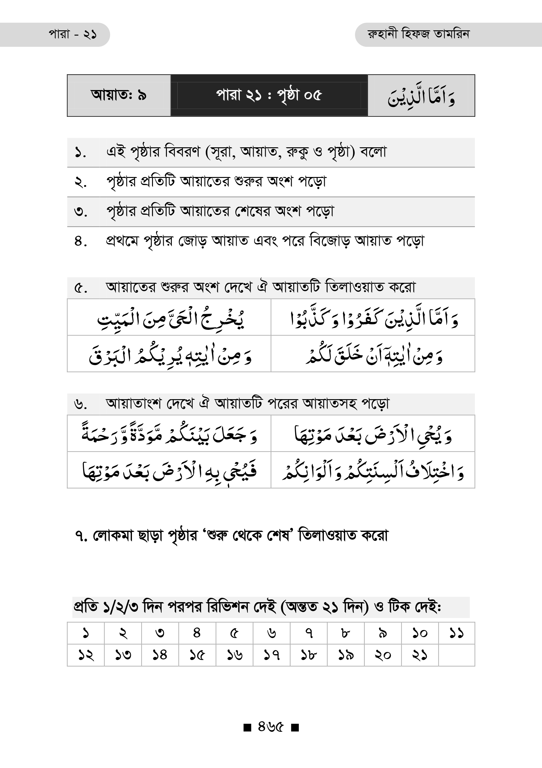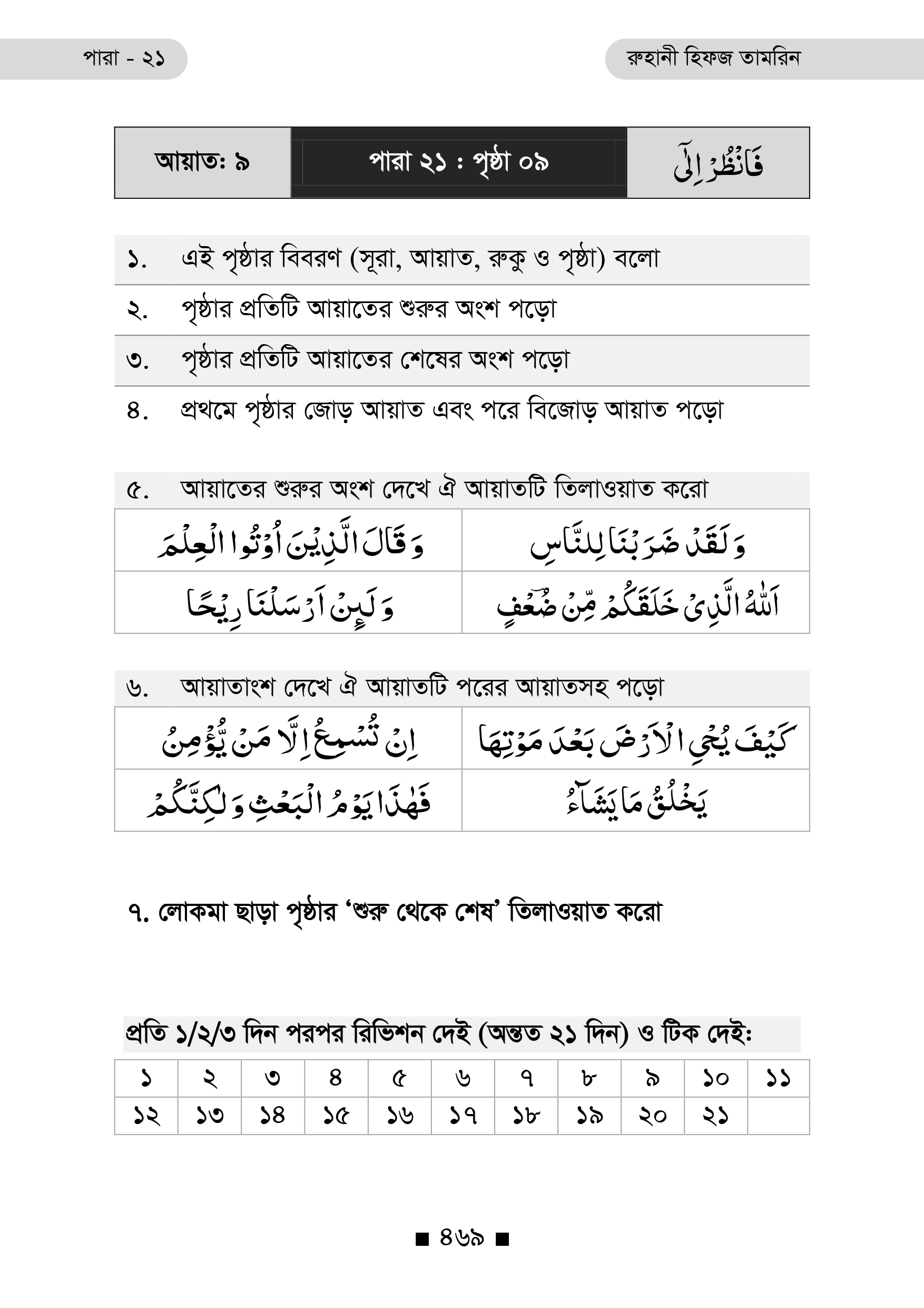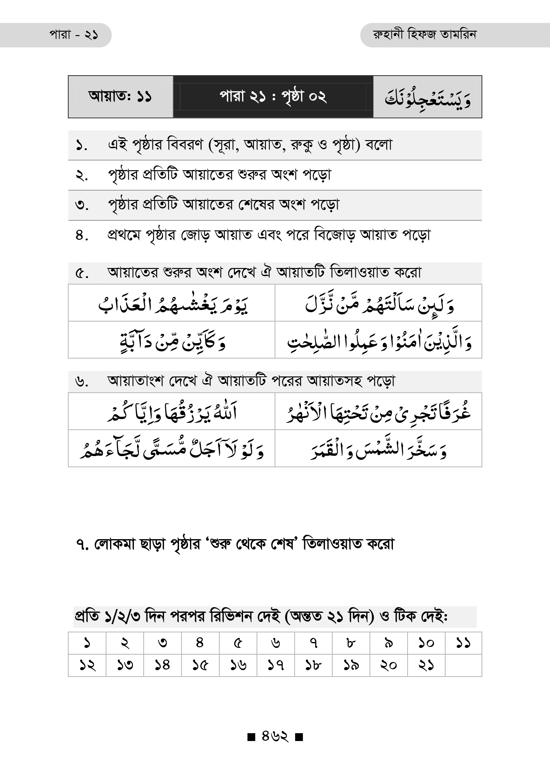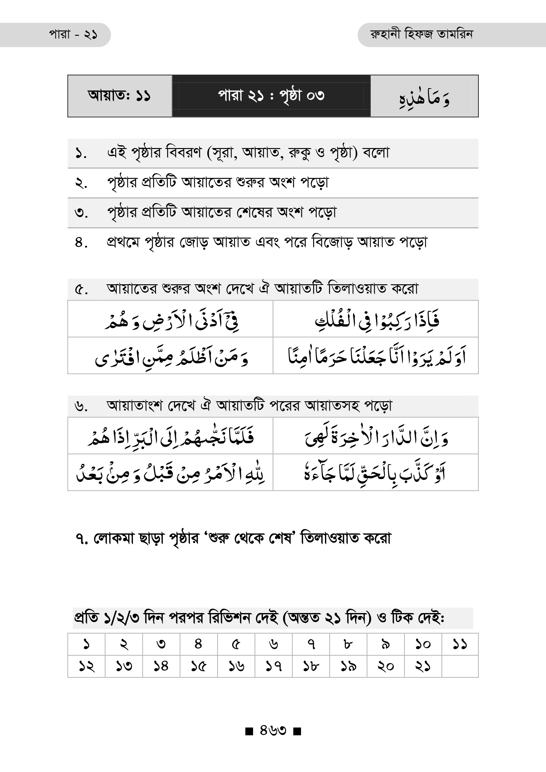 প্রতিটি পৃষ্ঠার নিচে রয়েছে ২১ দিনের রিভিশন টিক বক্স, যা ধারাবাহিক অধ্যবসায় ও স্মৃতি দৃঢ়ীকরণে অনুপ্রেরণা যোগায়।
